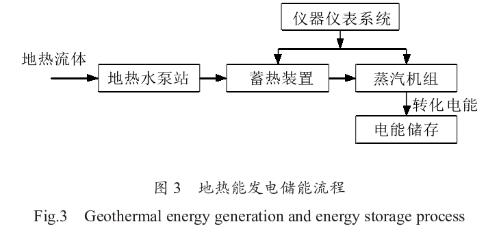 蒸汽機組是利用地熱流體中的熱能來驅(qū)動渦輪機發(fā)電的關(guān)鍵設(shè)備。高溫蒸汽通過管道輸送到蒸汽機組,推動渦輪葉片旋轉(zhuǎn),從而帶動發(fā)電機產(chǎn)生電力。蒸汽機組的效率和性能直接影響地熱能發(fā)電系統(tǒng)的整體效益。為了提高發(fā)電效率, 現(xiàn)代蒸汽機組通常采用高效的熱交換技術(shù)和先進的材料,以減少熱能損失和設(shè)備磨損。電池儲能裝置在地熱能發(fā)電中的應(yīng)用主要是為了平滑電力輸出,提升電網(wǎng)穩(wěn)定性。地熱能發(fā)電具有一定的間歇性和波動性,電池儲能系統(tǒng)可以在電力輸出不足時迅速補充電力,同時在電力過剩時存儲電能,以備后用。常見的電池儲能技術(shù)包括鋰離子電池、鈉硫電池和全釩液流電池等。這些電池系統(tǒng)不僅具有快速響應(yīng)能力,還能在一定程度上延長地熱能發(fā)電設(shè)備的使用壽命。地熱能發(fā)電儲能流程如圖3所示。