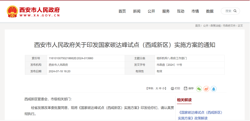7月19日,西安市人民政府面向西咸新區管委會,市級相關部門印發《國家碳達峰試點(西咸新區)實施方案》,聚焦綠色低碳發展能源和產業轉型瓶頸制約,加快提升能源清潔化利用效率、基礎設施綠色低碳化水平和減污降碳協同能力,全面推動產業高質量發展資源循環利用